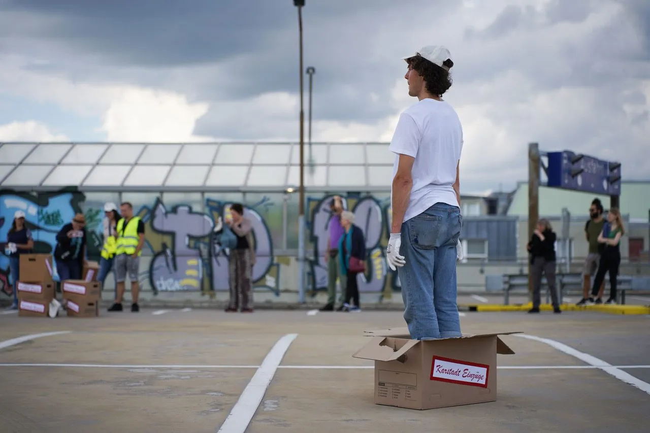 Disguised as a professional moving crew, complete with boxes, white gloves and red lettering, the procession carried through the neighbourhood all that had been promised but never delivered: transparent processes, real participation, social value, affordable space. The empty boxes became vessels of both loss and possibility – reminders of abandoned commitments and seeds of collective re-imagining.