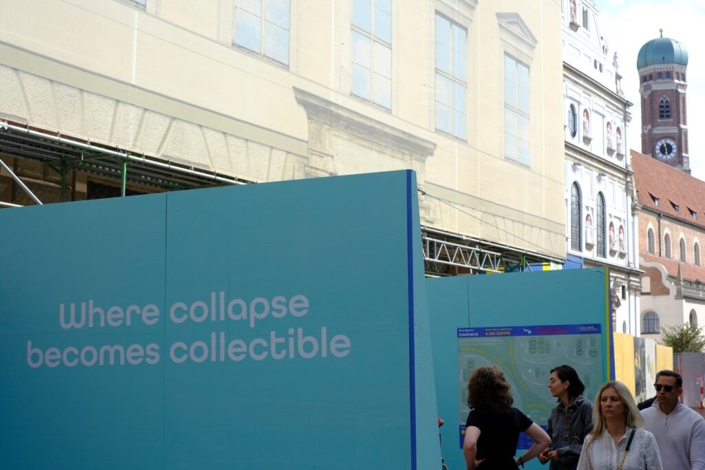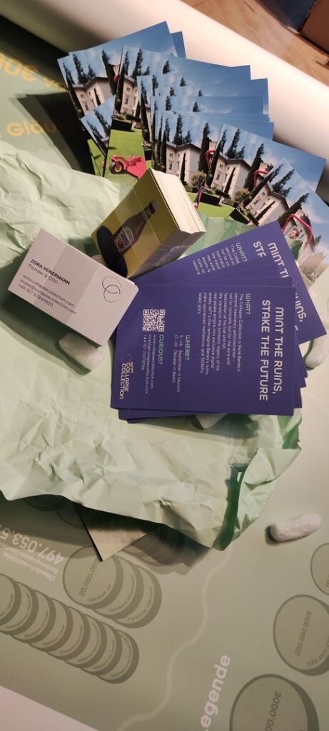 Installed within the ruins of Munich’s Alte Akademie, the Collapse Collection launched in autumn 2025. Disguised as a commercial startup, a small exhibition booth occupied the site for a weekend, offering its key assets: fan NFTs capturing the rise and fall of René Benko and the SIGNA Group.