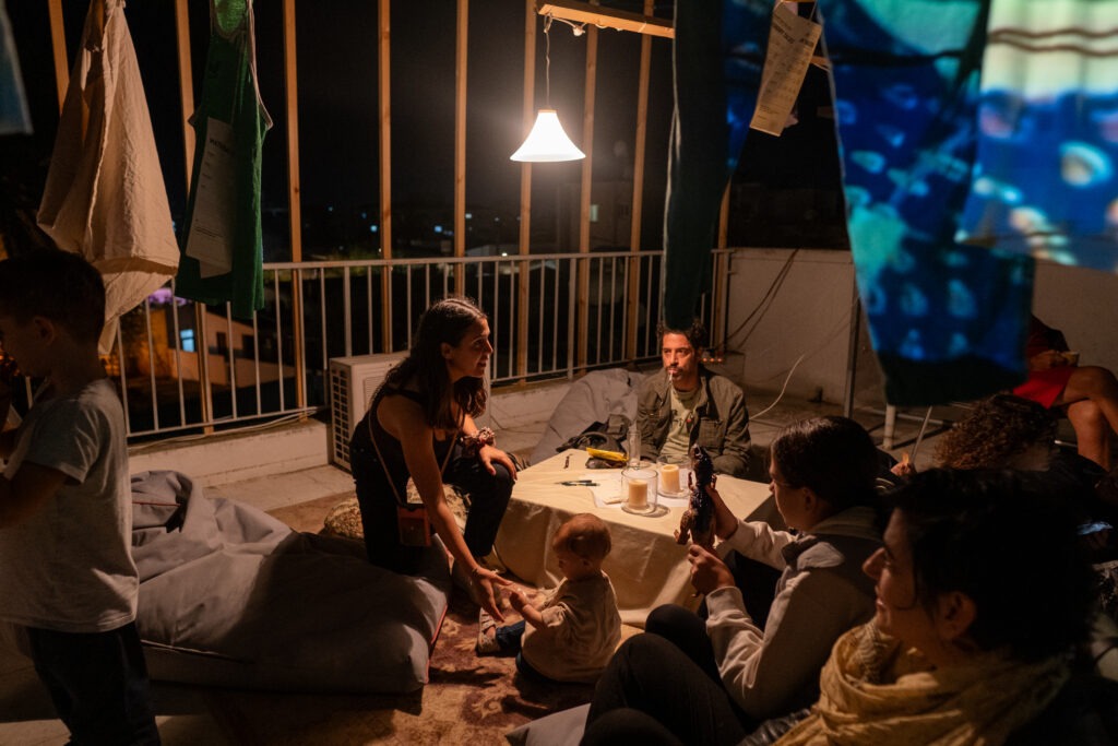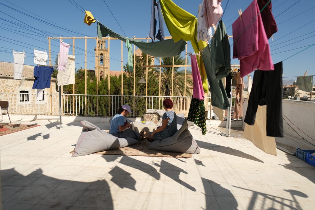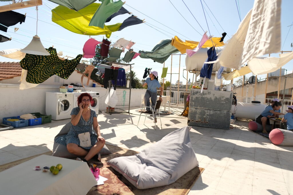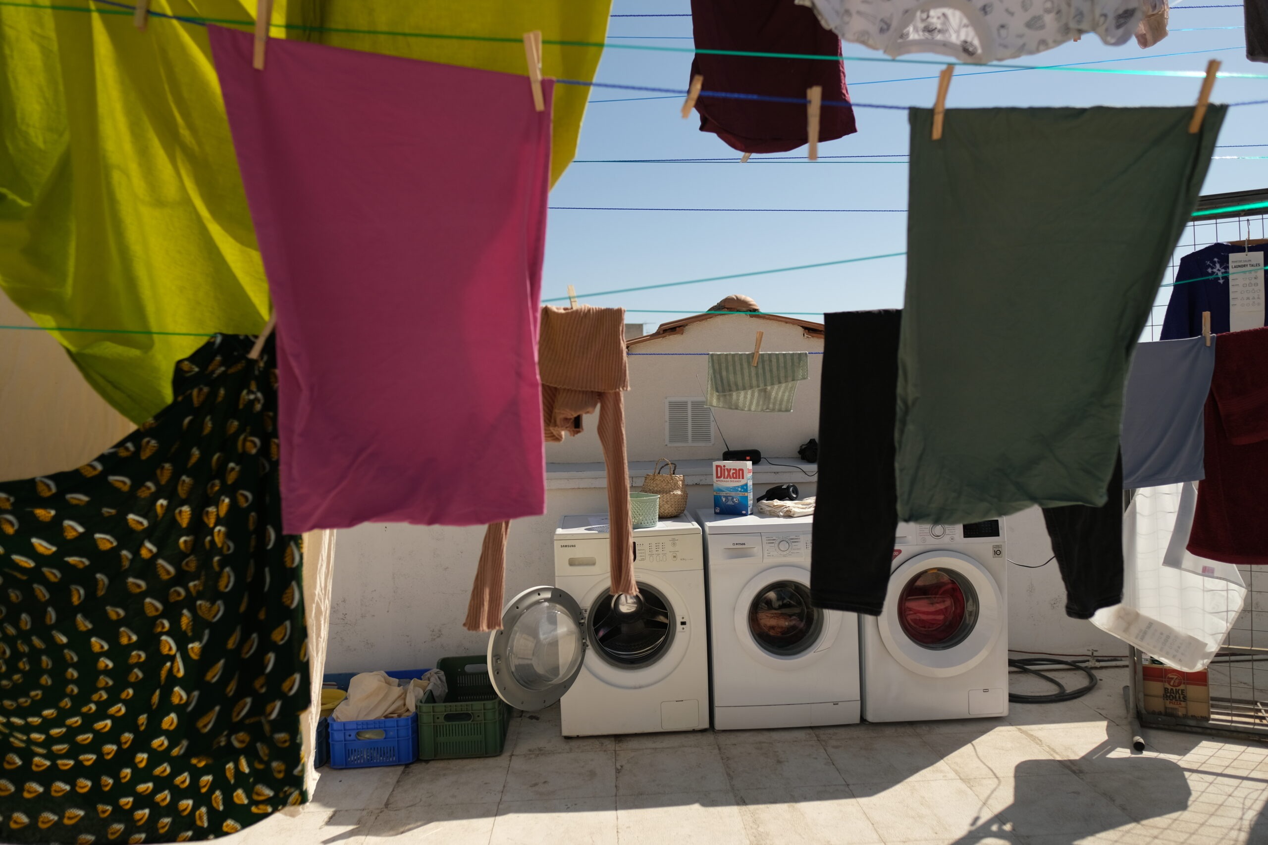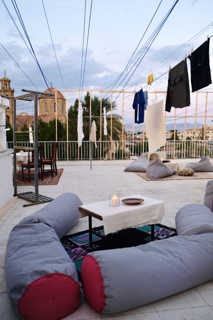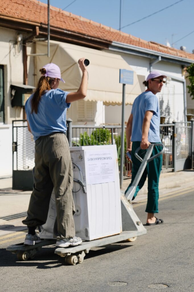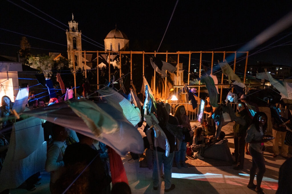 TEXT: As part of the Pame Kaimakli Festival, Operation Himmelblick created the Laundry Salon – an immersive, participatory installation developed through a week on site and pretests in Berlin. The project invited neighbours to rethink washing as a shared ritual, touching on the question of intimacy. Residents were encouraged to wash clothes on the rooftop, leaving one garment with an attached personal story for display throughout the festival, turning everyday textiles into a temporary communal archive.