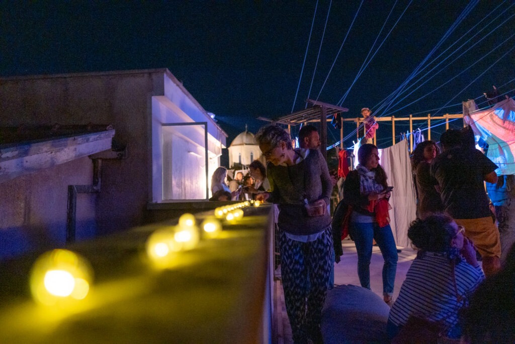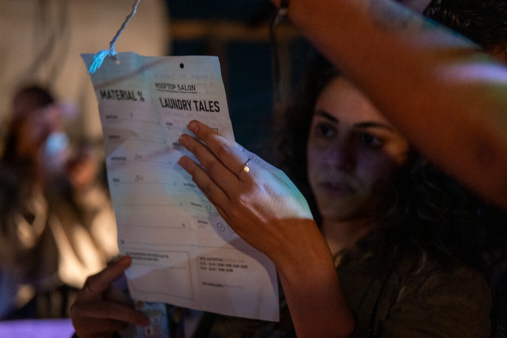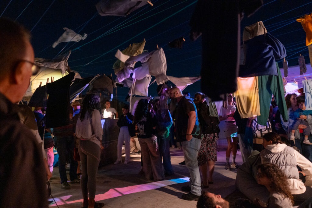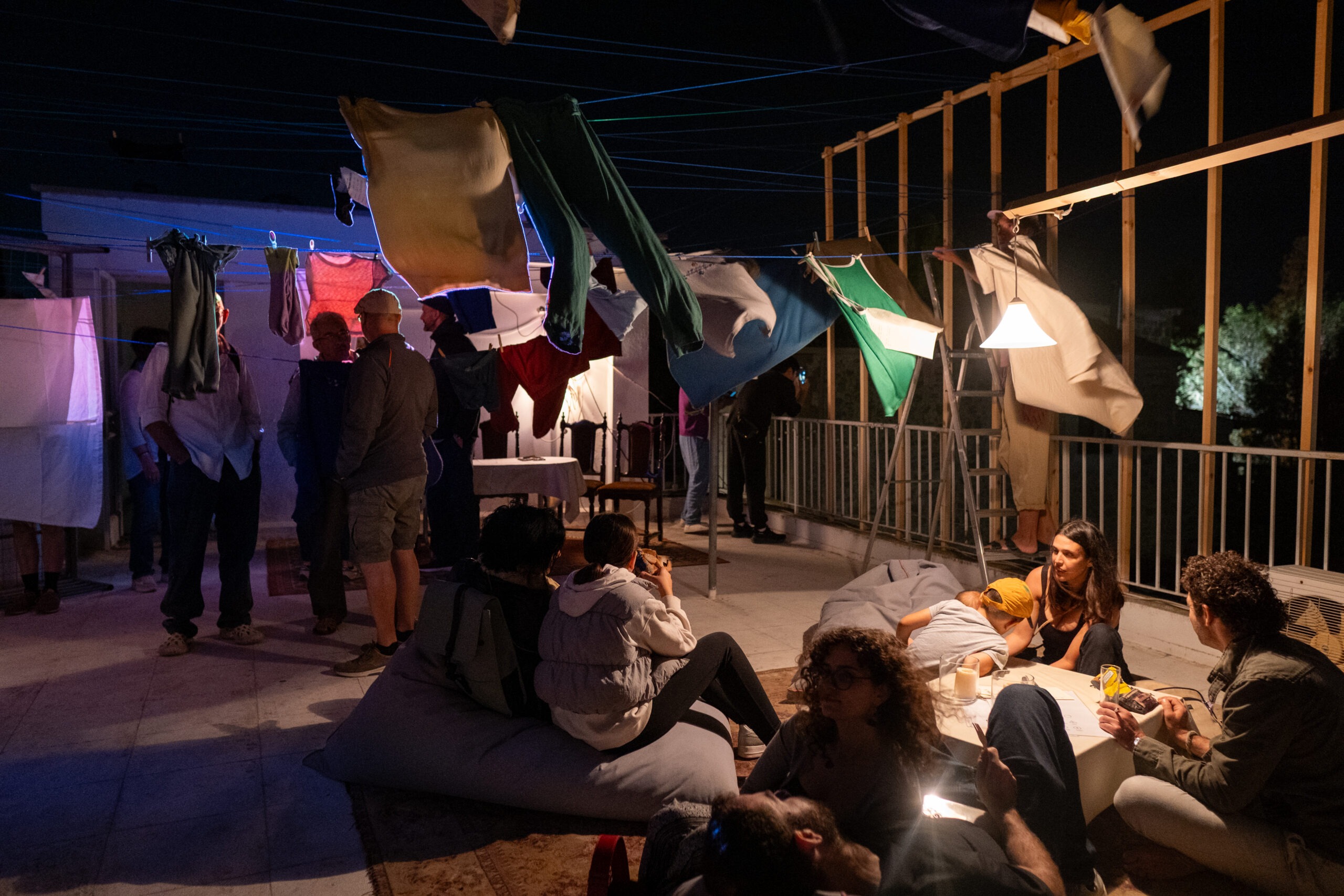 The washing-salon motif foregrounded intimacy, proximity, and the symbolic weight of clothing. By moving private garments into a public setting, participants navigated the boundary between domestic life and shared experience. Archival elements such as custom labels and washing-symbol designs preserved these exchanges. At the end, each garment returned to its owner marked with a new button – a small trace of a brief, communal rooftop world. The week ended with a final performance, which engaged the collected stories of Kaimakli.